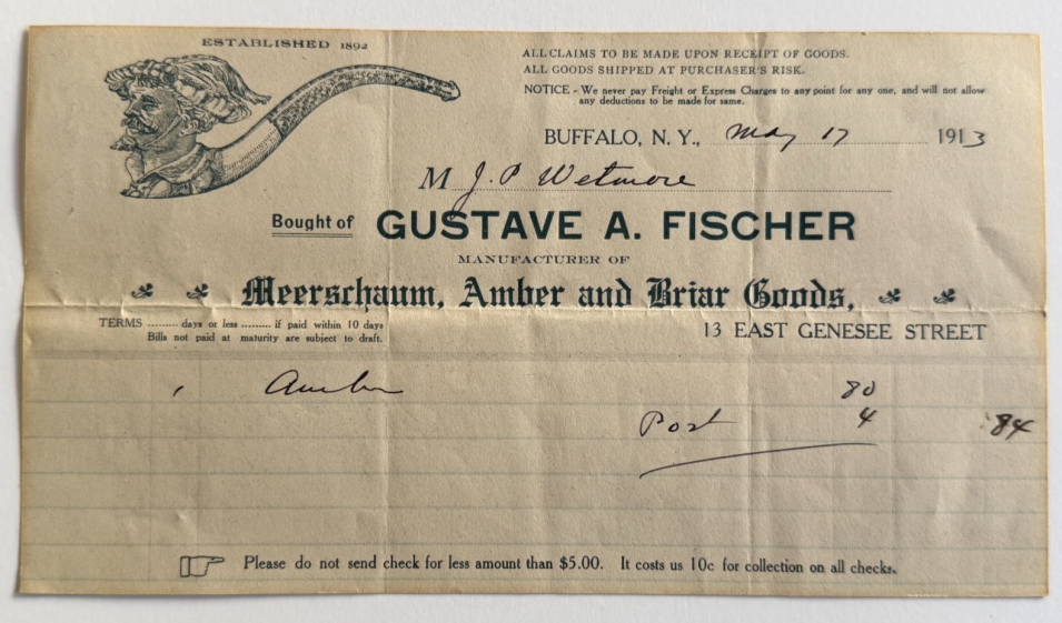 Gustave A. Fischer (sometimes written Gustave or Gustav A.) was born in Ruhla, Saxony, in 1865, born into a family where generations of pipe makers already existed. Ruhla was a global hub of pipemaking at the time. In 1880 when Gustave was 15, his family emigrated to the United States and initially settled in Brooklyn, NY. His father, August G. Fischer found a job with William Dumuth and Co (WDC) which was the largest importer of German pipes at the time. It is unclear if Gustave became married between then and 1892, but he moved to the frontier of Buffalo in June of 1982. Gustave would of been 27 at the time, and had married Emma in the timespan between 1886 and 1891. So Buffalo was a hopeful place to raise his new family.