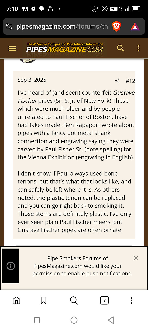 This is when I really began doing some research on this pipe. I came across this thread in a forum at Pipes Magazine.com. Now sure, I am very new to this hobby of pipe smoking and pipe collecting. Initially it looked like the poster was claiming that Buffalo Fischer pipes (New York) were attempting to counterfeit Gustav Fischer Sr's pipes. But I think it might be fair to say that scammers have for sure tried to counterfeit his pipes, but the suspect would not be the House of Fischer brand. It is fairly clear that the House of Fischer was a legetimate pipe making company, going back into the 19th century.